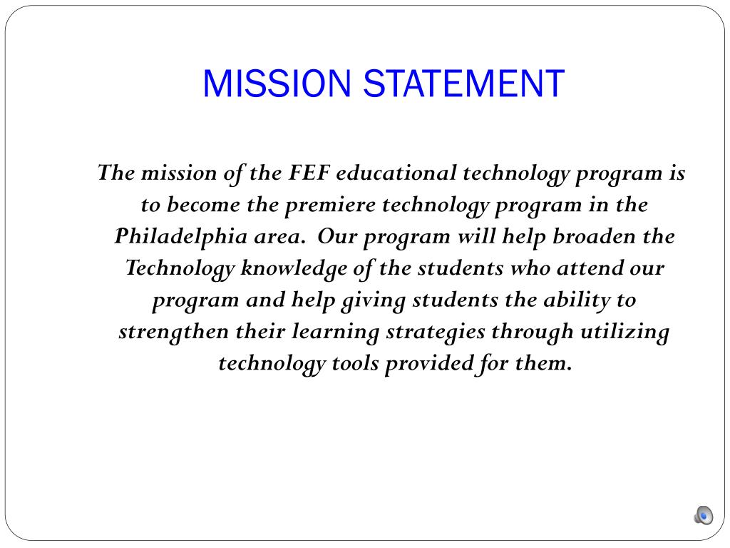 MISSION STATEMENT The mission of the FEF educational technology program is to become the premiere technology program in the Philadelphia area. Our program will help broaden the Technology knowledge of the students who attend our program and help giving students the ability to strengthen their learning strategies through utilizing technology tools provided for them.