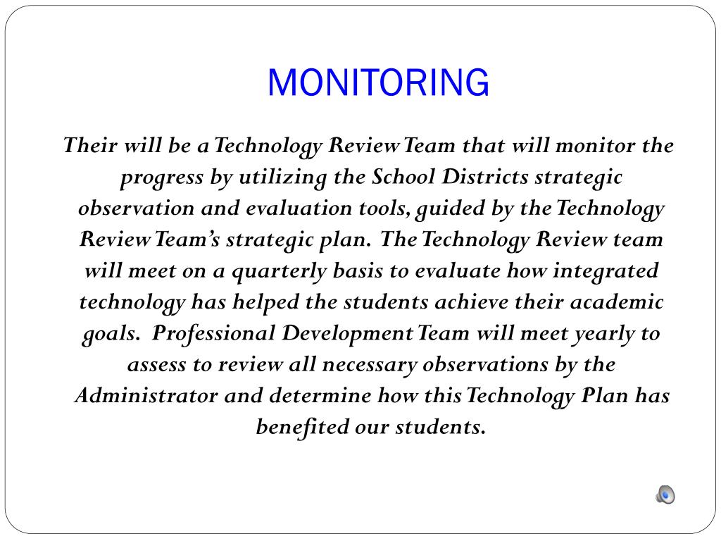MONITORING Their will be a Technology Review Team that will monitor the progress by utilizing the School Districts strategic observation and evaluation tools, guided by the Technology Review Team’s strategic plan. The Technology Review team will meet on a quarterly basis to evaluate how integrated technology has helped the students achieve their academic goals. Professional Development Team will meet yearly to assess to review all necessary observations by the Administrator and determine how this Technology Plan has benefited our students.