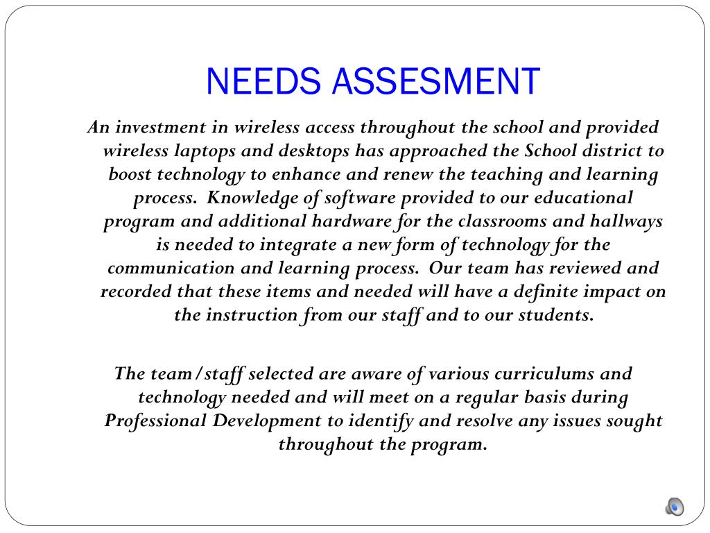 NEEDS ASSESMENT An investment in wireless access throughout the school and provided wireless laptops and desktops has approached the School district to boost technology to enhance and renew the teaching and learning process. Knowledge of software provided to our educational program and additional hardware for the classrooms and hallways is needed to integrate a new form of technology for the communication and learning process. Our team has reviewed and recorded that these items and needed will have a definite impact on the instruction from our staff and to our students. The team/staff selected are aware of various curriculums and technology needed and will meet on a regular basis during Professional Development to identify and resolve any issues sought throughout the program.