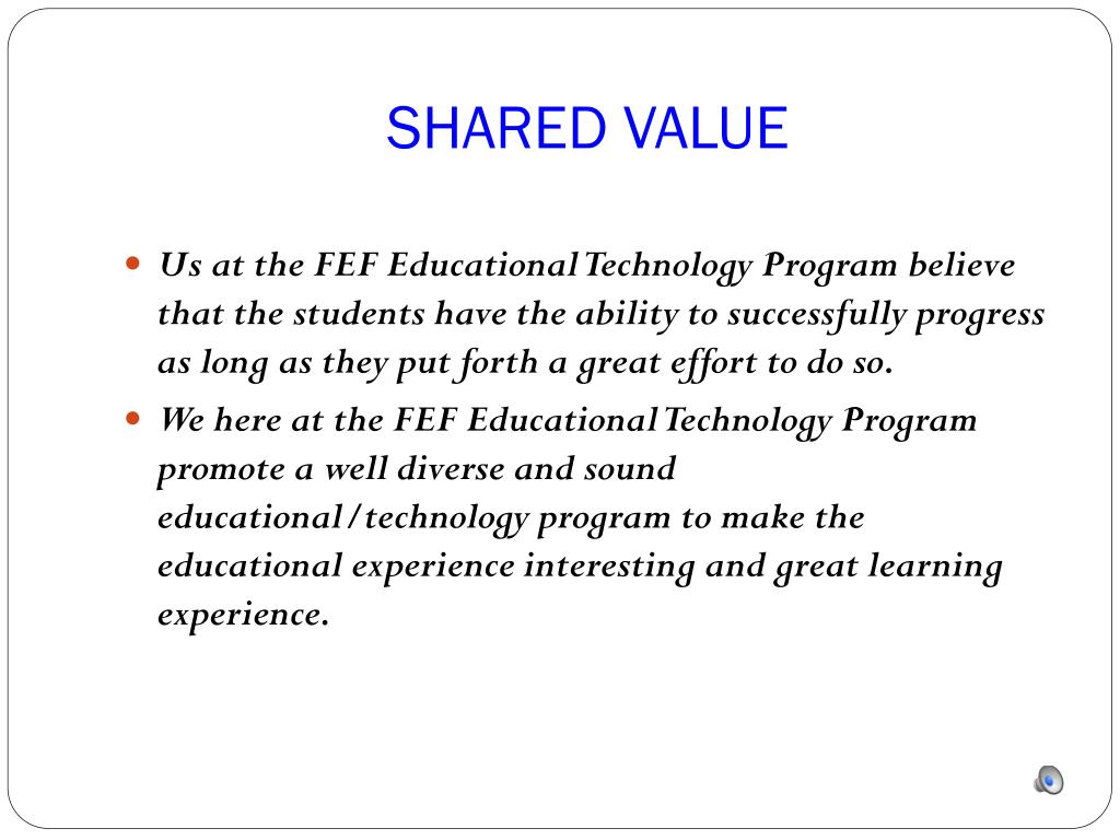 SHARED VALUE • Us at the FEF Educational Technology Program believe that the students have the ability to successfully progress as long as they put forth a great effort to do so. • We here at the FEF Educational Technology Program promote a well diverse and sound educational/technology program to make the educational experience interesting and great learning experience.