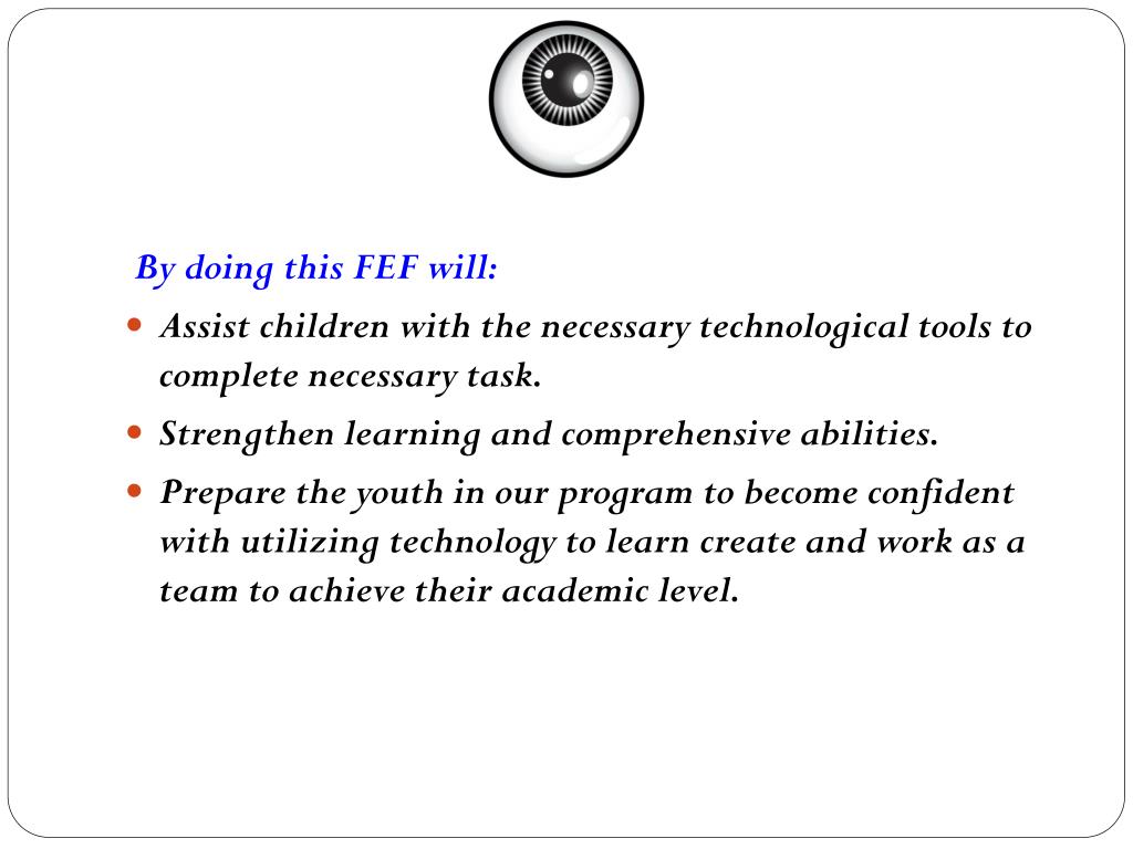 By doing this FEF will: • Assist children with the necessary technological tools to complete necessary task. • Strengthen learning and comprehensive abilities. • Prepare the youth in our program to become confident with utilizing technology to learn create and work as a team to achieve their academic level.