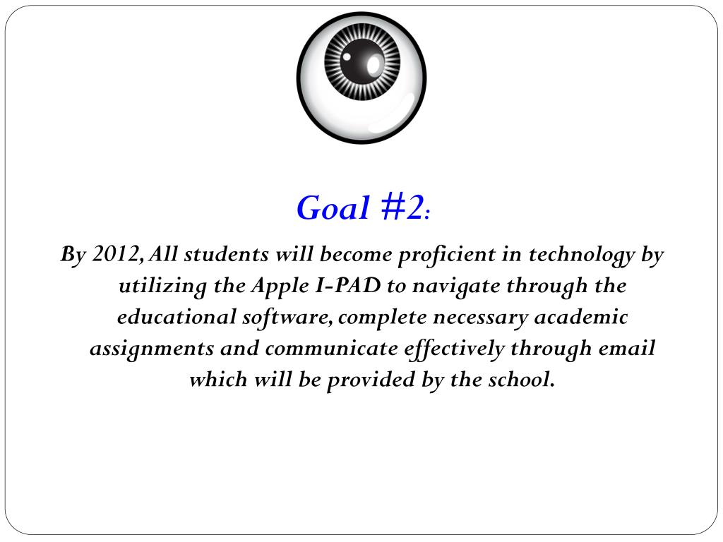 Goal #2: By 2012, All students will become proficient in technology by utilizing the Apple I-PAD to navigate through the educational software, complete necessary academic assignments and communicate effectively through email which will be provided by the school.
