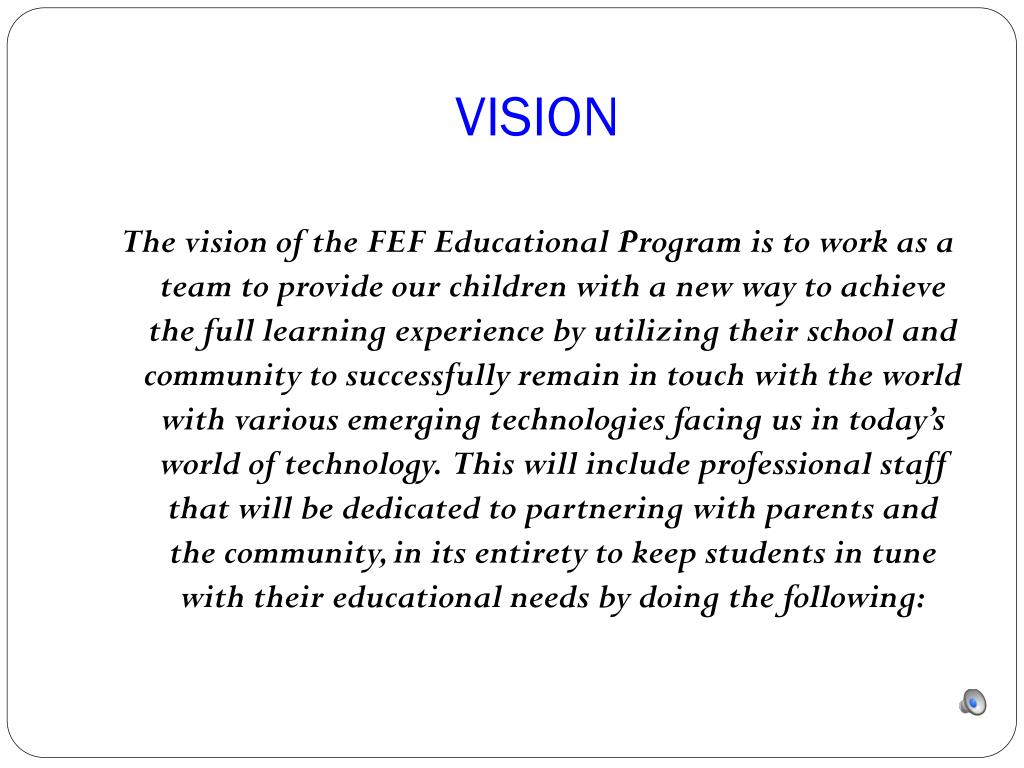 VISION The vision of the FEF Educational Program is to work as a team to provide our children with a new way to achieve the full learning experience by utilizing their school and community to successfully remain in touch with the world with various emerging technologies facing us in today’s world of technology. This will include professional staff that will be dedicated to partnering with parents and the community, in its entirety to keep students in tune with their educational needs by doing the following: