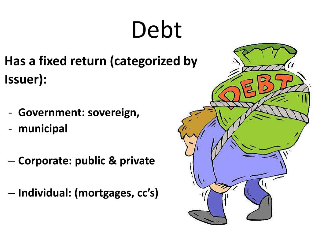 Debt • Has a fixed return (categorized by • Issuer): • Government: sovereign, • municipal • Corporate: public & private • Individual: (mortgages, cc’s)