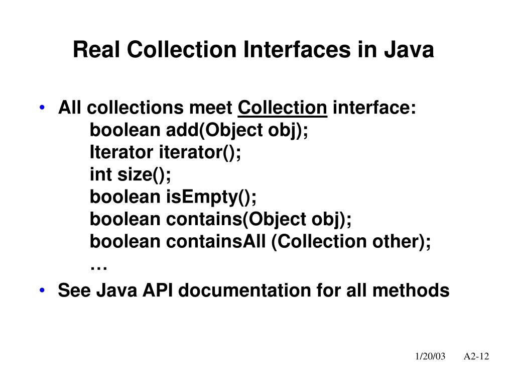 Real Collection Interfaces in Java • All collections meet Collection interface: boolean add(Object obj); Iterator iterator(); int size(); boolean isEmpty(); boolean contains(Object obj); boolean containsAll (Collection other); … • See Java API documentation for all methods