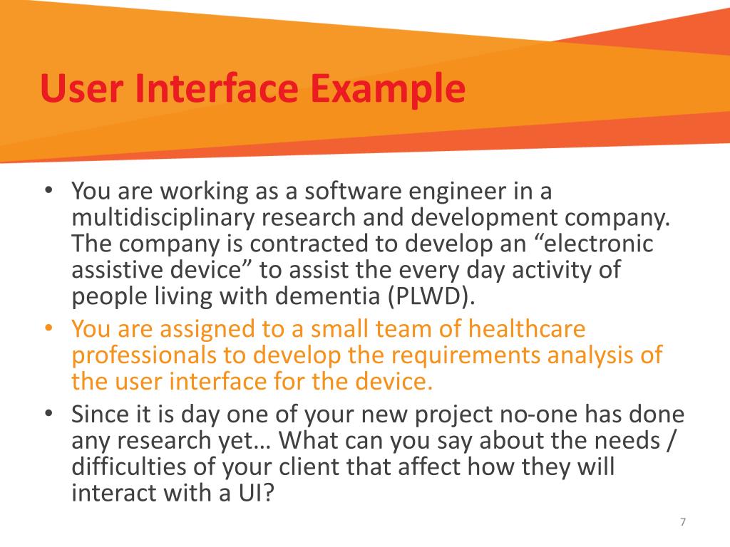 User Interface Example • You are working as a software engineer in a multidisciplinary research and development company. The company is contracted to develop an “electronic assistive device” to assist the every day activity of people living with dementia (PLWD). • You are assigned to a small team of healthcare professionals to develop the requirements analysis of the user interface for the device. • Since it is day one of your new project no-one has done any research yet… What can you say about the needs / difficulties of your client that affect how they will interact with a UI?