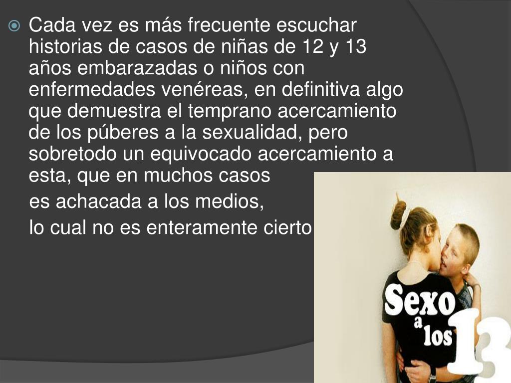Cada vez es más frecuente escuchar historias de casos de niñas de 12 y 13 años embarazadas o niños con enfermedades venéreas, en definitiva algo que demuestra el temprano acercamiento de los púberes a la sexualidad, pero sobretodo un equivocado acercamiento a esta, que en muchos casos es achacada a los medios, lo cual no es enteramente cierto.