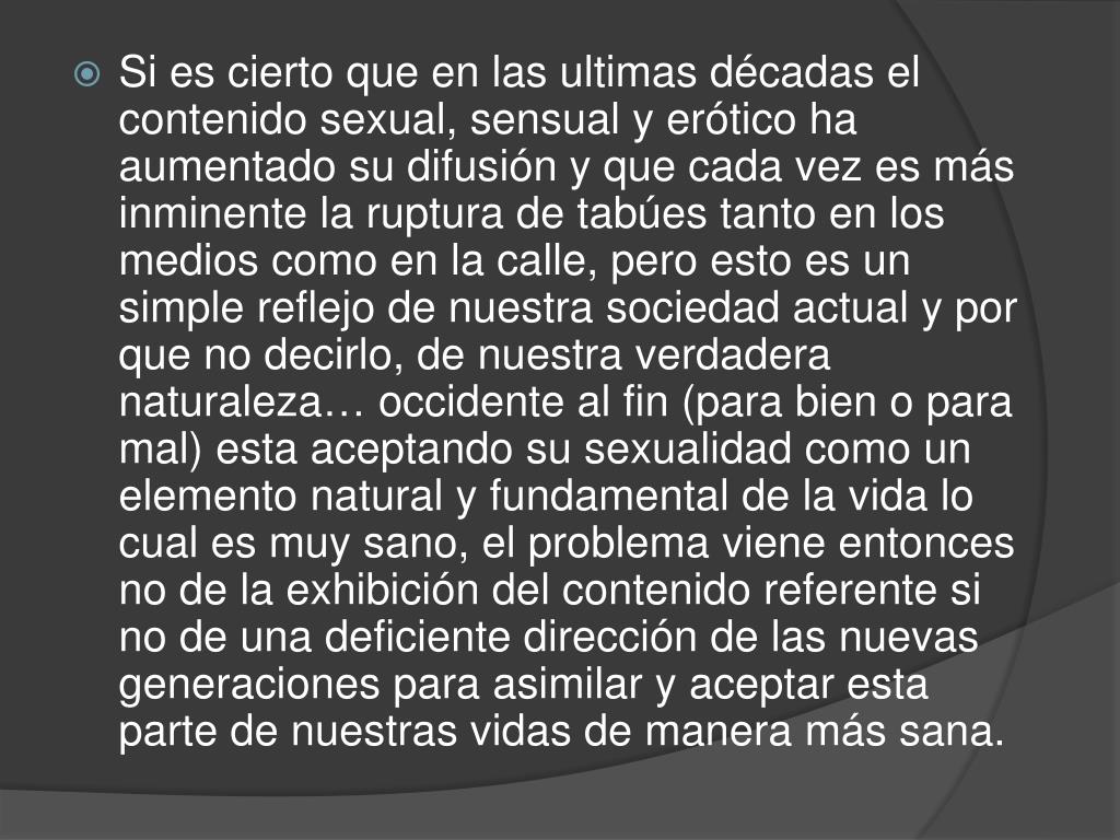 Si es cierto que en las ultimas décadas el contenido sexual, sensual y erótico ha aumentado su difusión y que cada vez es más inminente la ruptura de tabúes tanto en los medios como en la calle, pero esto es un simple reflejo de nuestra sociedad actual y por que no decirlo, de nuestra verdadera naturaleza… occidente al fin (para bien o para mal) esta aceptando su sexualidad como un elemento natural y fundamental de la vida lo cual es muy sano, el problema viene entonces no de la exhibición del contenido referente si no de una deficiente dirección de las nuevas generaciones para asimilar y aceptar esta parte de nuestras vidas de manera más sana.