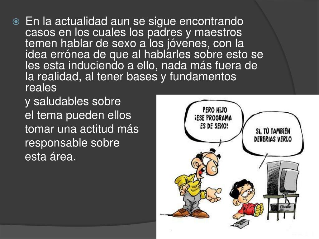 En la actualidad aun se sigue encontrando casos en los cuales los padres y maestros temen hablar de sexo a los jóvenes, con la idea errónea de que al hablarles sobre esto se les esta induciendo a ello, nada más fuera de la realidad, al tener bases y fundamentos reales y saludables sobre el tema pueden ellos tomar una actitud más responsable sobre esta área.
