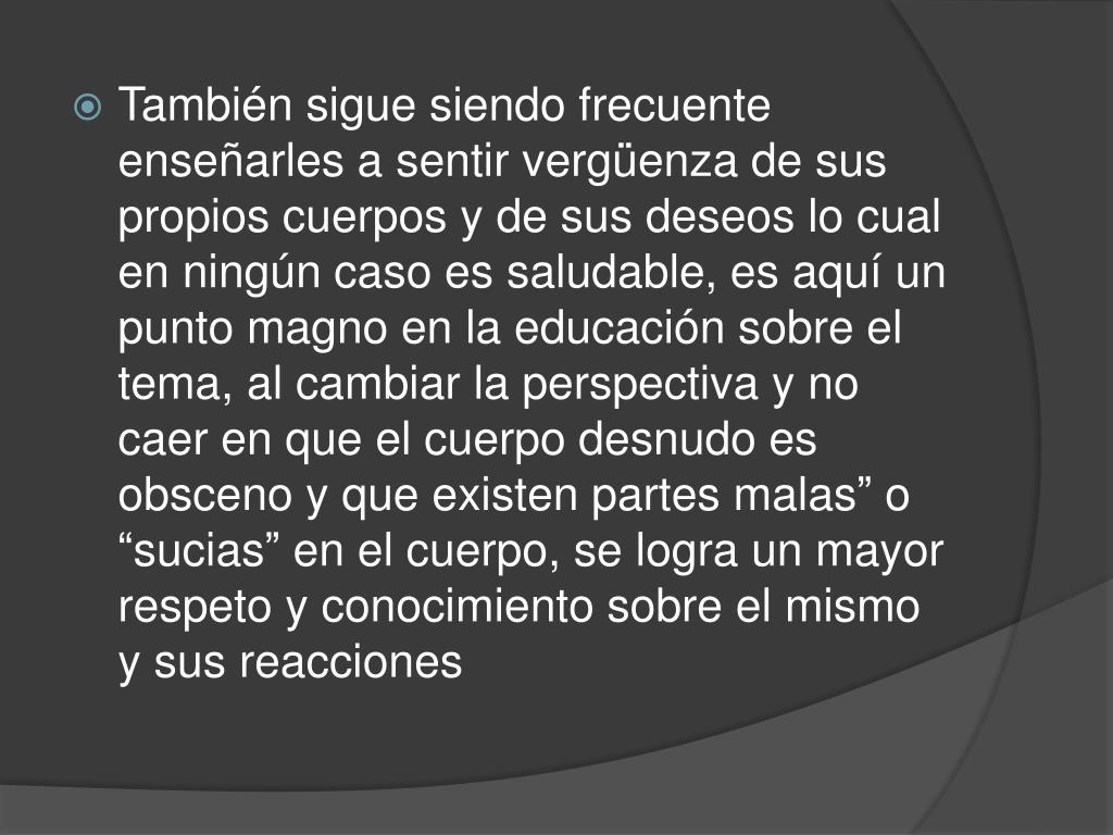 También sigue siendo frecuente enseñarles a sentir vergüenza de sus propios cuerpos y de sus deseos lo cual en ningún caso es saludable, es aquí un punto magno en la educación sobre el tema, al cambiar la perspectiva y no caer en que el cuerpo desnudo es obsceno y que existen partes malas” o “sucias” en el cuerpo, se logra un mayor respeto y conocimiento sobre el mismo y sus reacciones