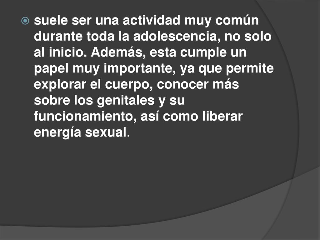 suele ser una actividad muy común durante toda la adolescencia, no solo al inicio. Además, esta cumple un papel muy importante, ya que permite explorar el cuerpo, conocer más sobre los genitales y su funcionamiento, así como liberar energía sexual.