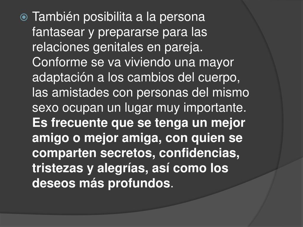 También posibilita a la persona fantasear y prepararse para las relaciones genitales en pareja. Conforme se va viviendo una mayor adaptación a los cambios del cuerpo, las amistades con personas del mismo sexo ocupan un lugar muy importante. Es frecuente que se tenga un mejor amigo o mejor amiga, con quien se comparten secretos, confidencias, tristezas y alegrías, así como los deseos más profundos.