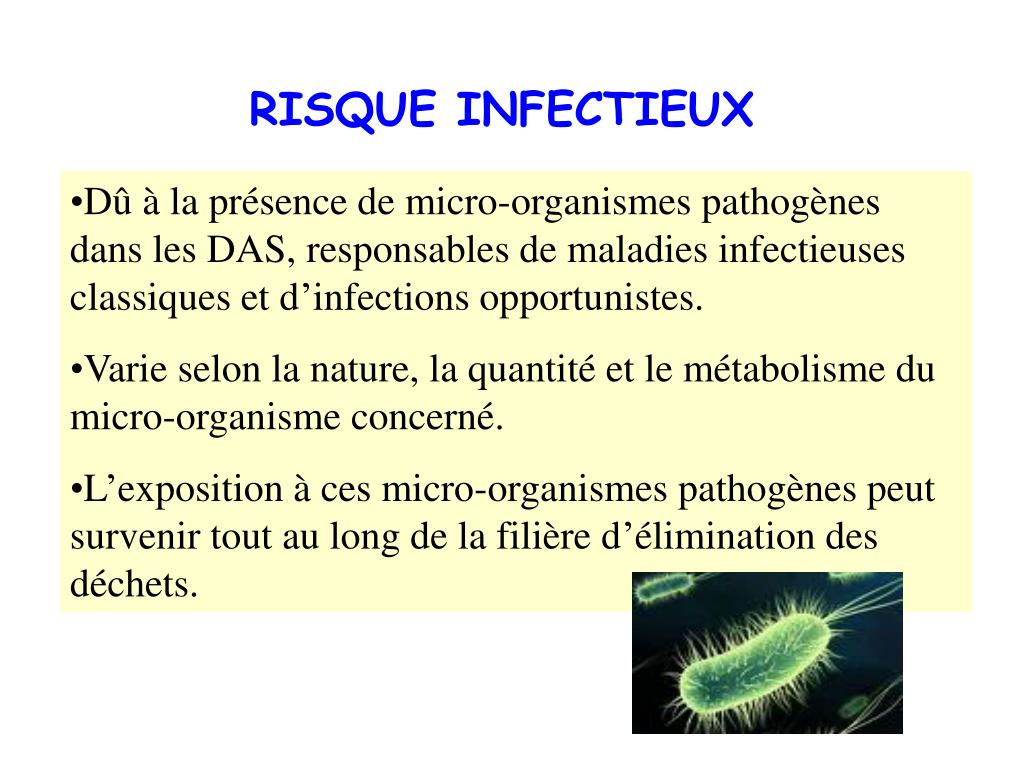 RISQUE INFECTIEUX • Dû à la présence de micro-organismes pathogènes dans les DAS, responsables de maladies infectieuses classiques et d’infections opportunistes. • Varie selon la nature, la quantité et le métabolisme du micro-organisme concerné. • L’exposition à ces micro-organismes pathogènes peut survenir tout au long de la filière d’élimination des déchets.