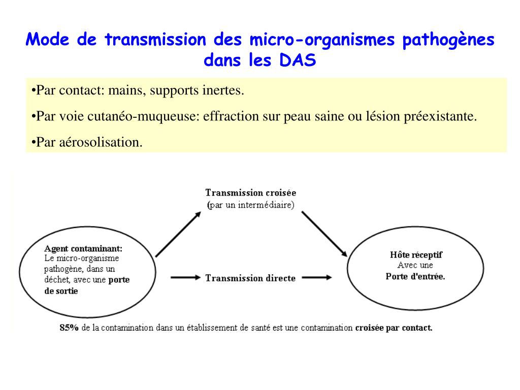 Mode de transmission des micro-organismes pathogènes dans les DAS • Par contact: mains, supports inertes. • Par voie cutanéo-muqueuse: effraction sur peau saine ou lésion préexistante. • Par aérosolisation.