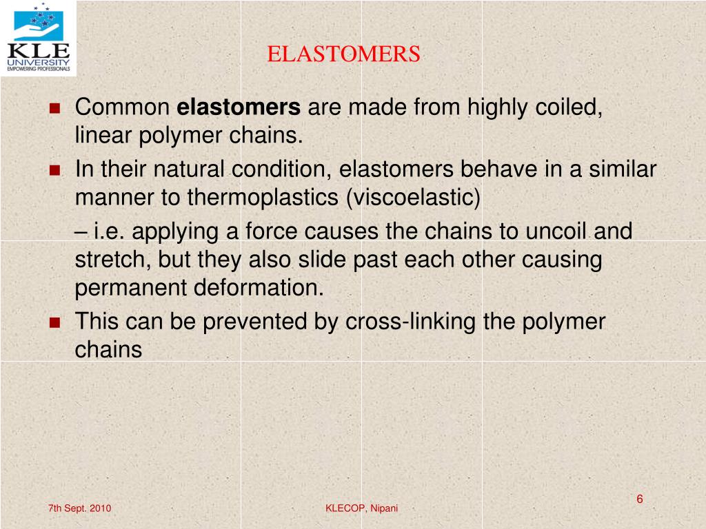 ELASTOMERS • Common elastomers are made from highly coiled, linear polymer chains. • In their natural condition, elastomers behave in a similar manner to thermoplastics (viscoelastic) – i.e. applying a force causes the chains to uncoil and stretch, but they also slide past each other causing permanent deformation. • This can be prevented by cross-linking the polymer chains KLECOP, Nipani 6