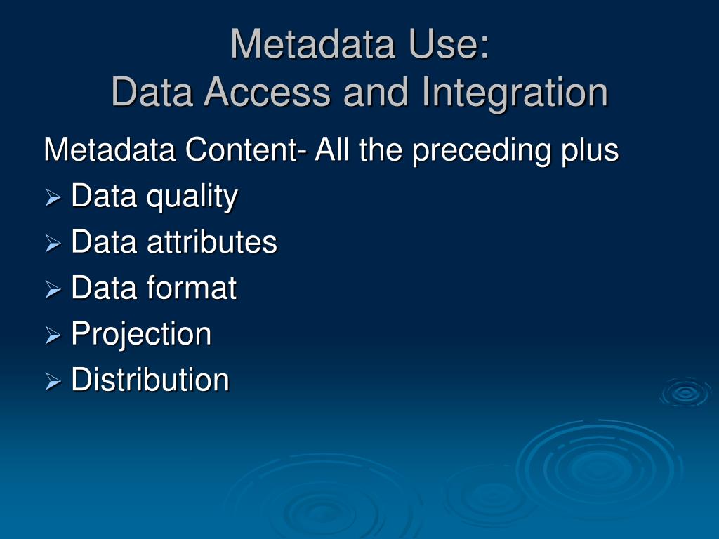 Metadata Use:Data Access and Integration Metadata Content- All the preceding plus • Data quality • Data attributes • Data format • Projection • Distribution