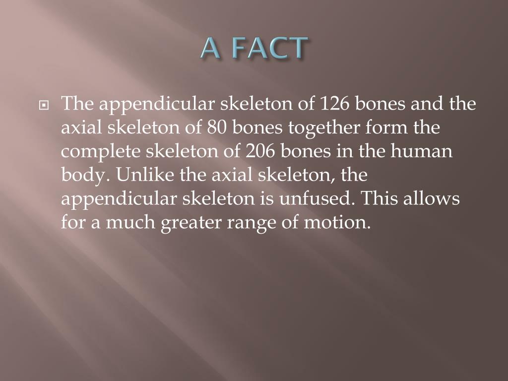 A FACT • The appendicular skeleton of 126 bones and the axial skeleton of 80 bones together form the complete skeleton of 206 bones in the human body. Unlike the axial skeleton, the appendicular skeleton is unfused. This allows for a much greater range of motion.
