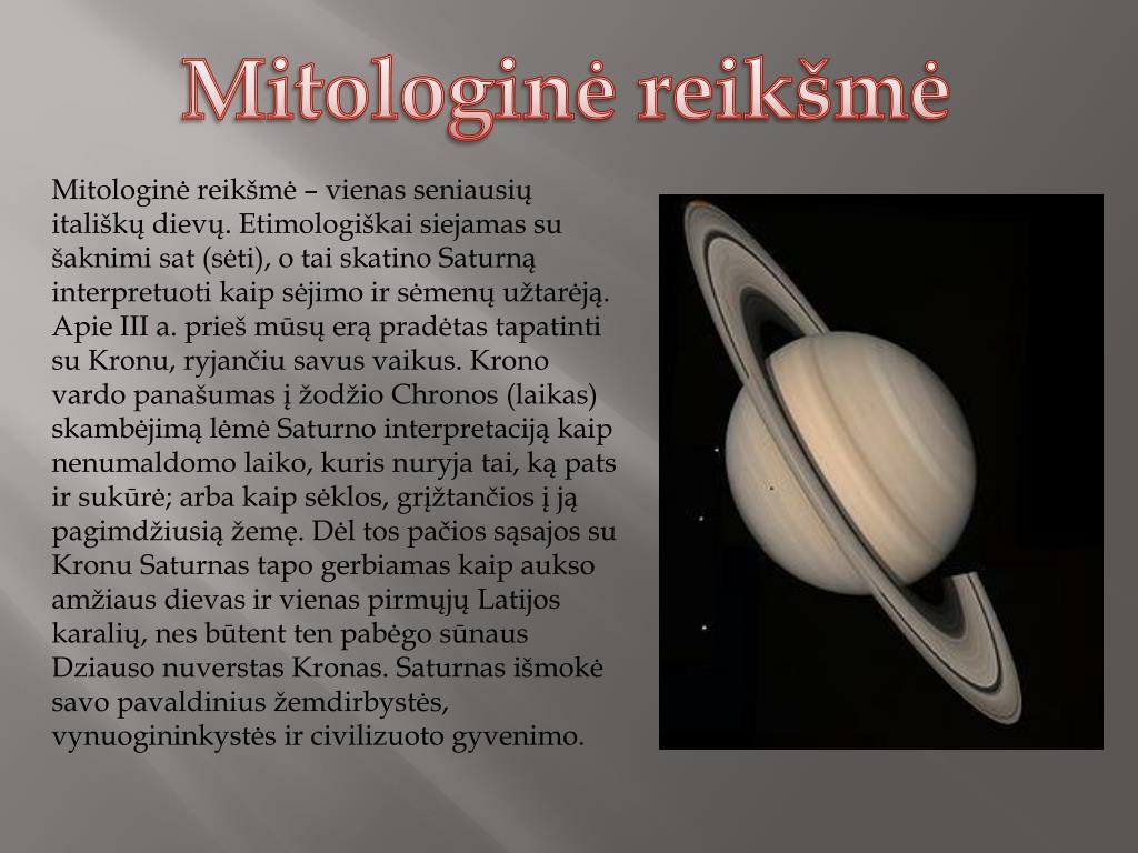 Turinys 1. Saturnas.2. Sudėtis.3. Fizinės charakteristikos.4. Palydovai.5. Titanas.6. Žiedai.7. Video apie saturną.8. Mitologinė reikšmė.9. Panaudota literatūra.10. Pabaiga.