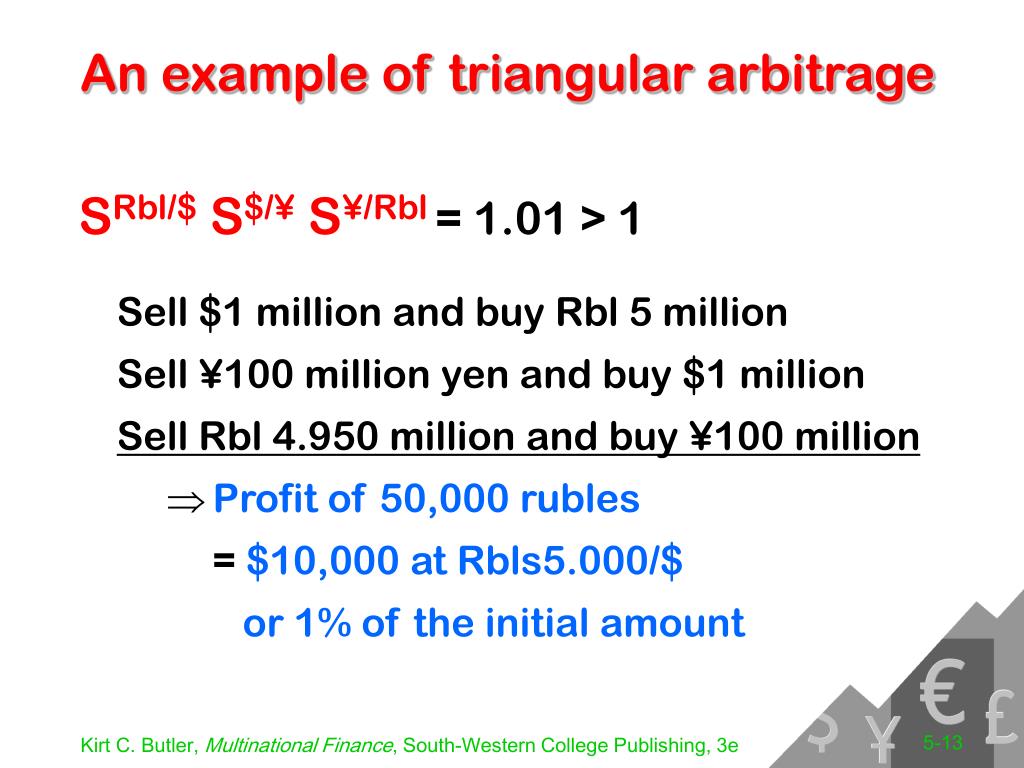 Cross exchange rates and triangular arbitrage Suppose SRbl/$ = Rbl 5.000/$ Û S$/Rbl= $0.2000/Rbl S$/¥ = $0.01000/¥ Û S¥/$ = ¥100.0/$ S¥/Rbl = ¥20.20/Rbl Û SRbl/¥» Rbl 0.04950/¥ SRbl/$ S$/¥ S¥/Rbl = (Rbl 5/$)($.01/¥)(¥20.20/Rbl) = 1.01 > 1