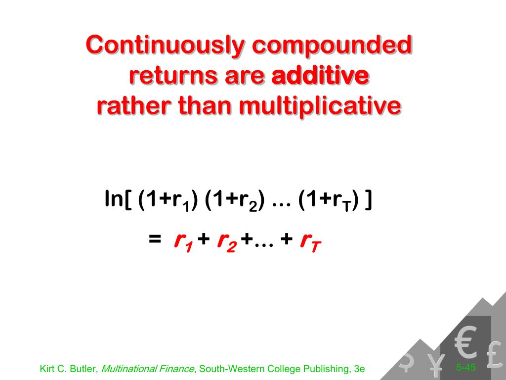 Continuously compounded returns are additiverather than multiplicative ln[ (1+r1) (1+r2) ... (1+rT) ] = r1 + r2 +... + rT