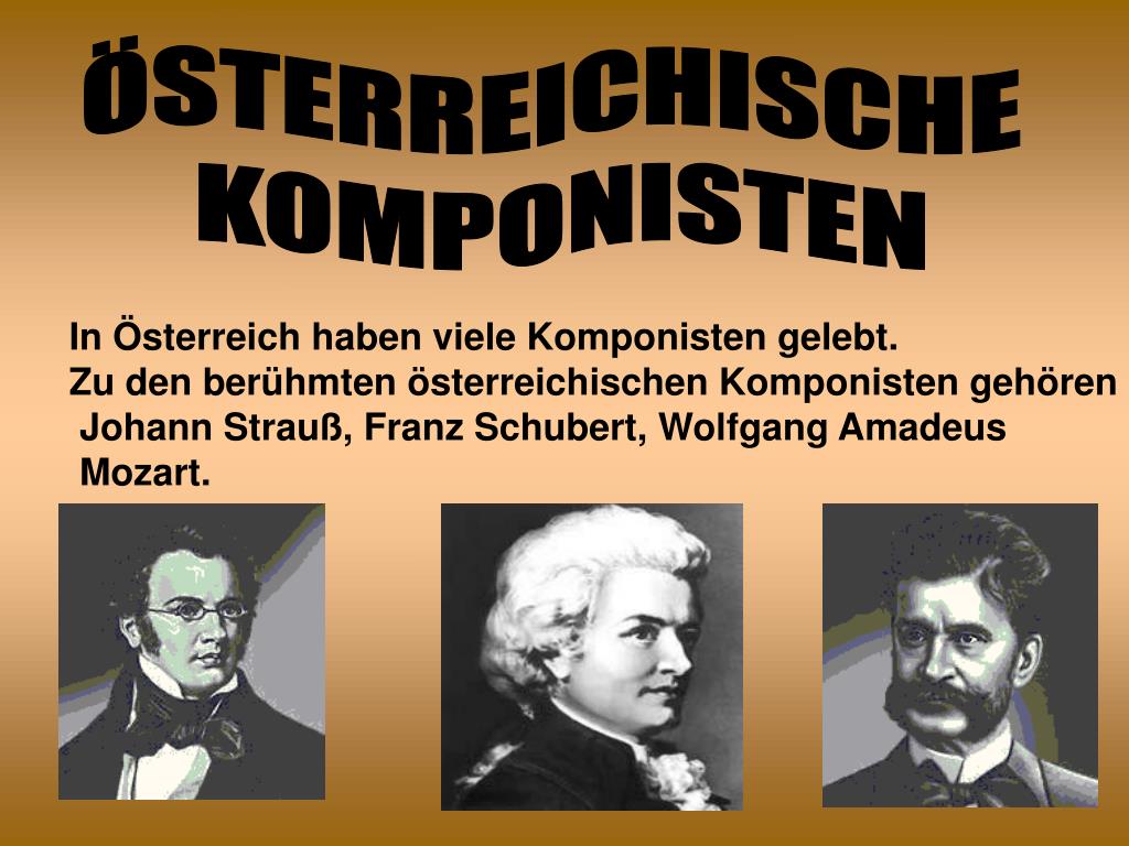 ÖSTERREICHISCHE KOMPONISTEN In Österreich haben viele Komponisten gelebt. Zu den berühmten österreichischen Komponisten gehören Johann Strauß, Franz Schubert, Wolfgang Amadeus Mozart.