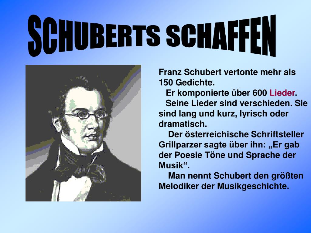 SCHUBERTS SCHAFFEN Franz Schubert vertonte mehr als 150 Gedichte. Er komponierte über 600 Lieder. Seine Lieder sind verschieden. Sie sind lang und kurz, lyrisch oder dramatisch. Der österreichische Schriftsteller Grillparzer sagte über ihn: „Er gab der Poesie Töne und Sprache der Musik“. Man nennt Schubert den größten Melodiker der Musikgeschichte.