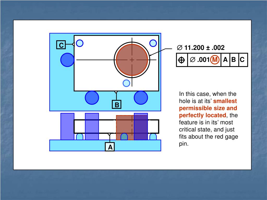 11.200 ± .002 .001 M A B C B C A In this case, when the hole is at its’ smallest permissible size and perfectly located, the feature is in its’ most critical state, and just fits about the red gage pin.
