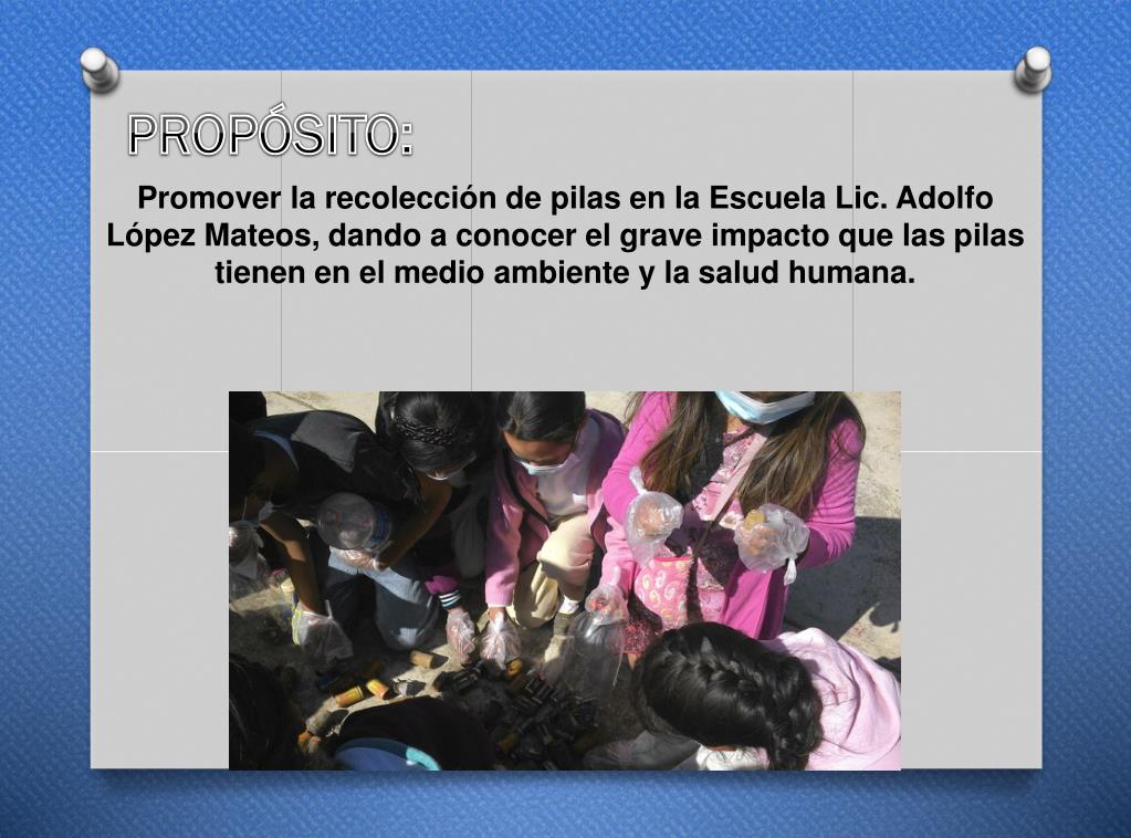 PROPÓSITO: Promover la recolección de pilas en la Escuela Lic. Adolfo López Mateos, dando a conocer el grave impacto que las pilas tienen en el medio ambiente y la salud humana.