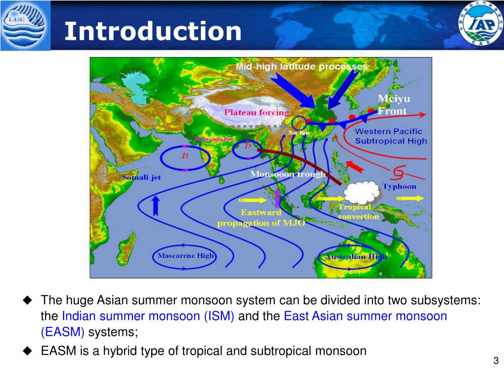 Introduction • The huge Asian summer monsoon system can be divided into two subsystems: the Indian summer monsoon (ISM) and the East Asian summer monsoon (EASM) systems; • EASM is a hybrid type of tropical and subtropical monsoon