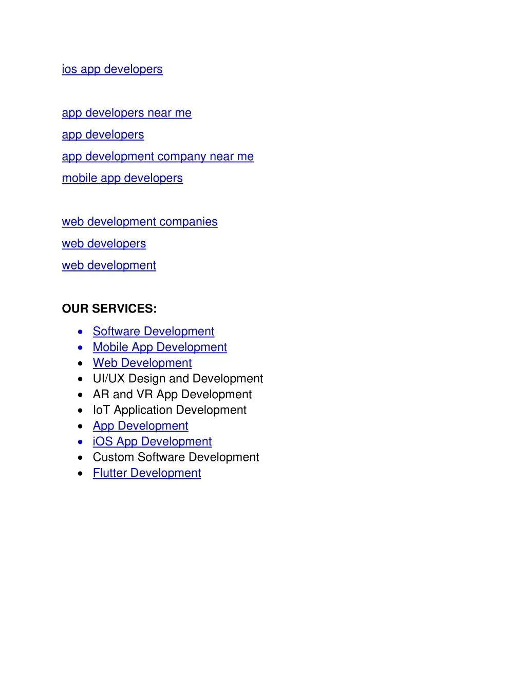 ios app developers app developers near me app developers app development company near me mobile app developers web development companies web developers web development OUR SERVICES: •Software Development •Mobile App Development •Web Development •UI/UX Design and Development •AR and VR App Development •IoT Application Development •App Development •iOS App Development •Custom Software Development •Flutter Development