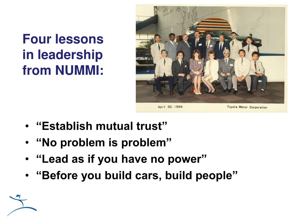 Four lessons in leadership from NUMMI: • “Establish mutual trust” • “No problem is problem” • “Lead as if you have no power” • “Before you build cars, build people”