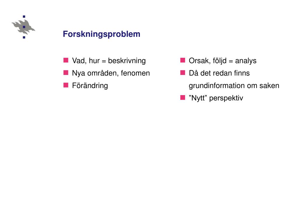 Vad, hur = beskrivning Nya områden, fenomen Förändring Orsak, följd = analys Då det redan finns grundinformation om saken ”Nytt” perspektiv Forskningsproblem