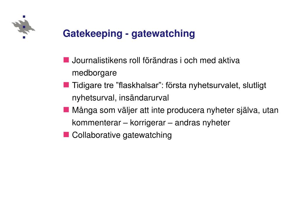 Gatekeeping - gatewatching • Journalistikens roll förändras i och med aktiva medborgare • Tidigare tre ”flaskhalsar”: första nyhetsurvalet, slutligt nyhetsurval, insändarurval • Många som väljer att inte producera nyheter själva, utan kommenterar – korrigerar – andras nyheter • Collaborative gatewatching