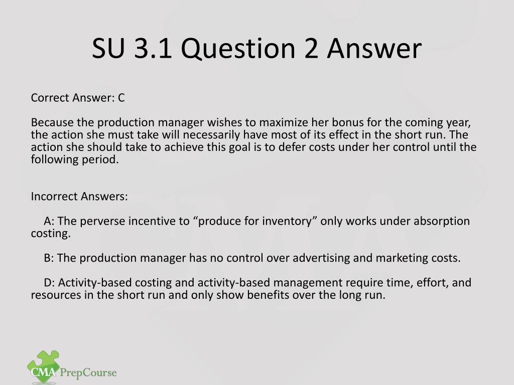 SU 3.1 Question 2 Answer Correct Answer: C Because the production manager wishes to maximize her bonus for the coming year, the action she must take will necessarily have most of its effect in the short run. The action she should take to achieve this goal is to defer costs under her control until the following period. Incorrect Answers: A: The perverse incentive to “produce for inventory” only works under absorption costing. B: The production manager has no control over advertising and marketing costs. D: Activity-based costing and activity-based management require time, effort, and resources in the short run and only show benefits over the long run.