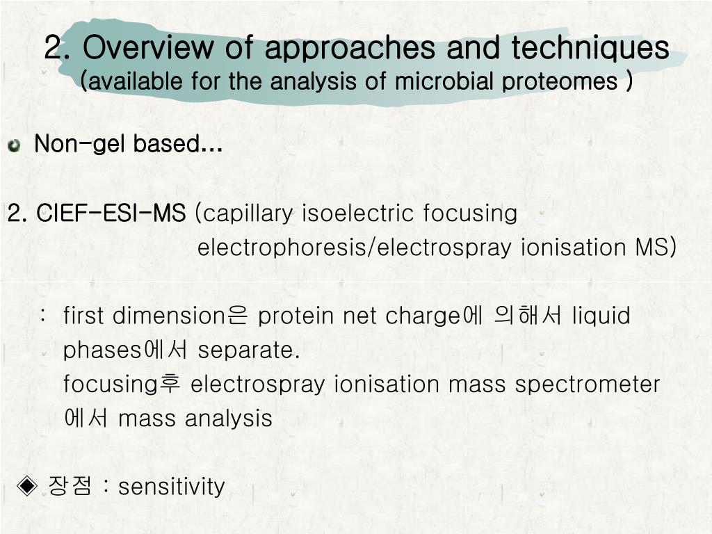 2. Overview of approaches and techniques(available for the analysis of microbial proteomes ) • Non-gel based… 2. CIEF-ESI-MS (capillary isoelectric focusing electrophoresis/electrospray ionisation MS) : first dimension은 protein net charge에 의해서 liquid phases에서 separate. focusing후 electrospray ionisation mass spectrometer 에서 mass analysis ◈ 장점 : sensitivity