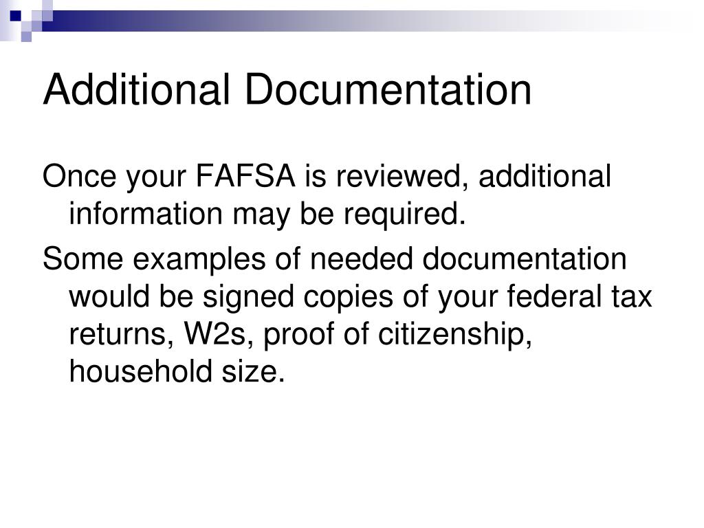 Additional Documentation Once your FAFSA is reviewed, additional information may be required. Some examples of needed documentation would be signed copies of your federal tax returns, W2s, proof of citizenship, household size.