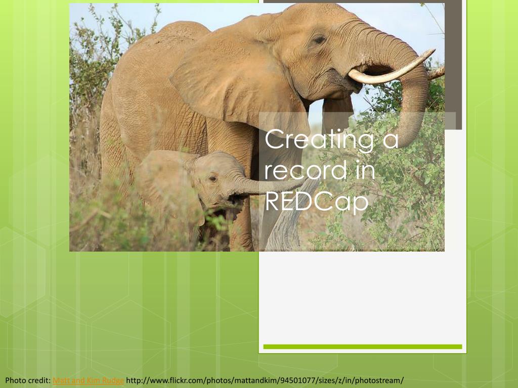 Creating a record in REDCap Photo credit: Matt and Kim Rudge http://www.flickr.com/photos/mattandkim/94501077/sizes/z/in/photostream/