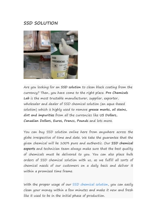 1. SSD SOLUTION Are you looking for an SSD solution to clean black coating from the currency? Then, you have come to the right place. Pro Chemicals Lab is the most trustable manufacturer, supplier, exporter, wholesaler and dealer of SSD chemical solution (an aqua-based solution) which is highly used to remove grease marks, oil stains, dirt and impurities from all the currencies like US Dollars, Canadian Dollars, Euros, Francs, Pounds and lots more. You can buy SSD solution online here from anywhere across the globe irrespective of time and date. We take the guarantee that the given chemical will be 100% pure and authentic. Our SSD chemical experts and technician team always make sure that the best quality of chemicals must be delivered to you. You can also place bulk orders of SSD chemical solution with us, as we fulfill all sorts of chemical needs of our customers on a daily basis and deliver it within a promised time frame. With the proper usage of our SSD chemical solution, you can easily clean your money within a few minutes and make it new and fresh like it used to be in the initial phase of production.