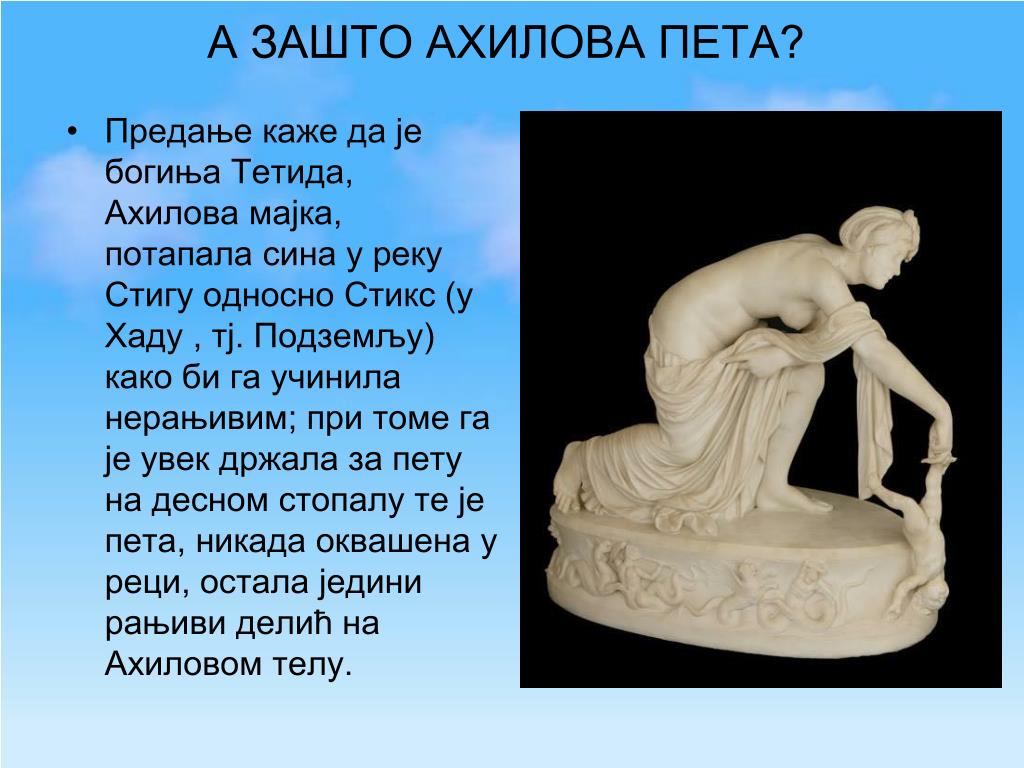 3. А ЗАШТО АХИЛОВА ПЕТА? • Предање каже да је богиња Тетида, Ахилова мајка, потапала сина у реку Стигу односно Стикс (у Хаду , тј. Подземљу) како би га учинила нерањивим; при томе га је увек држала за пету на десном стопалу те је пета, никада оквашена у реци, остала једини рањиви делић на Ахиловом телу.