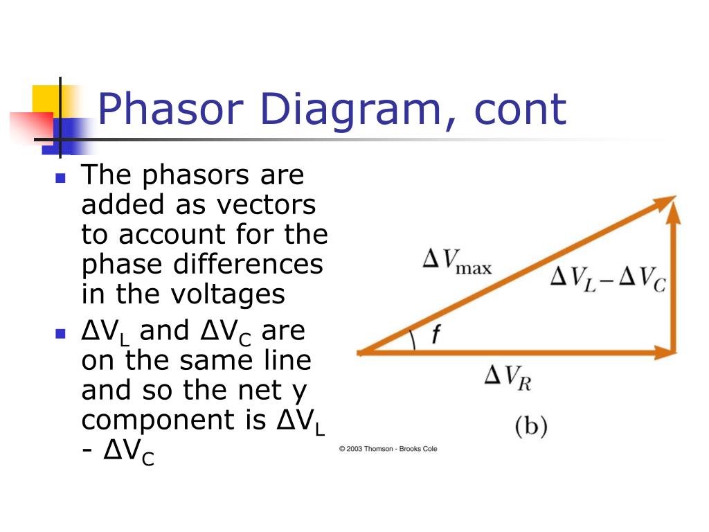 Phasor Diagram, cont • The phasors are added as vectors to account for the phase differences in the voltages • ΔVL and ΔVC are on the same line and so the net y component is ΔVL - ΔVC