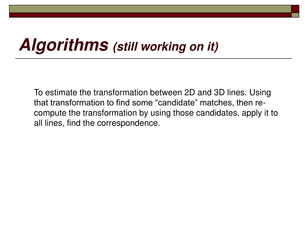 Algorithms (still working on it) To estimate the transformation between 2D and 3D lines. Using that transformation to find some “candidate” matches, then re-compute the transformation by using those candidates, apply it to all lines, find the correspondence.