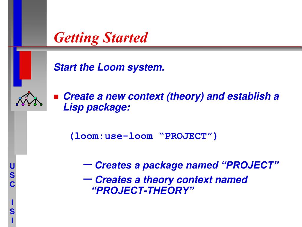 Getting Started • Start the Loom system. • Create a new context (theory) and establish a Lisp package: • (loom:use-loom “PROJECT”) • Creates a package named “PROJECT” • Creates a theory context named “PROJECT-THEORY”