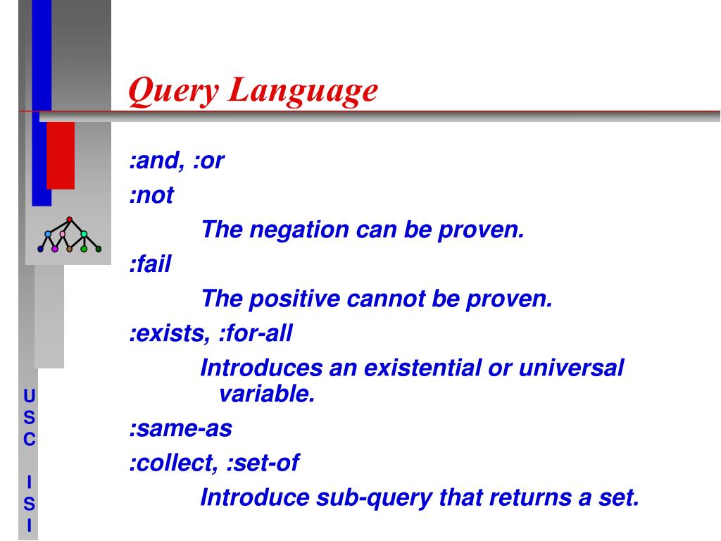 Query Language • :and, :or • :not • The negation can be proven. • :fail • The positive cannot be proven. • :exists, :for-all • Introduces an existential or universal variable. • :same-as • :collect, :set-of • Introduce sub-query that returns a set.
