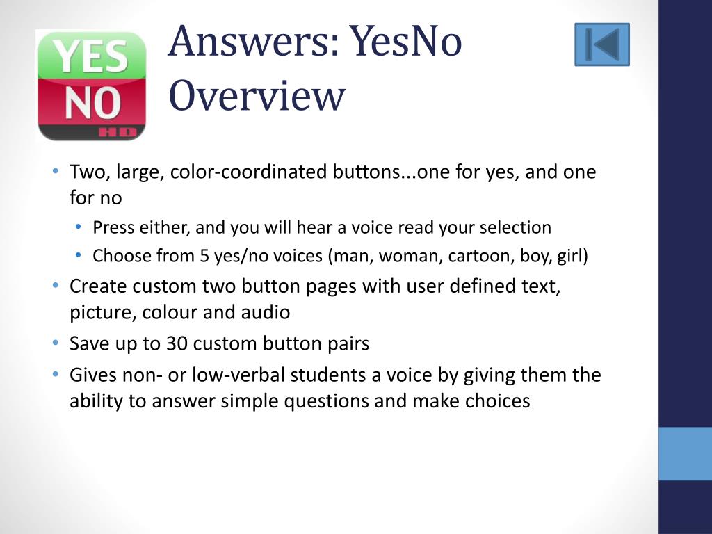 Answers: YesNoOverview • Two, large, color-coordinated buttons...one for yes, and one for no • Press either, and you will hear a voice read your selection • Choose from 5 yes/no voices (man, woman, cartoon, boy, girl) • Create custom two button pages with user defined text, picture, colour and audio • Save up to 30 custom button pairs • Gives non- or low-verbal students a voice by giving them the ability to answer simple questions and make choices