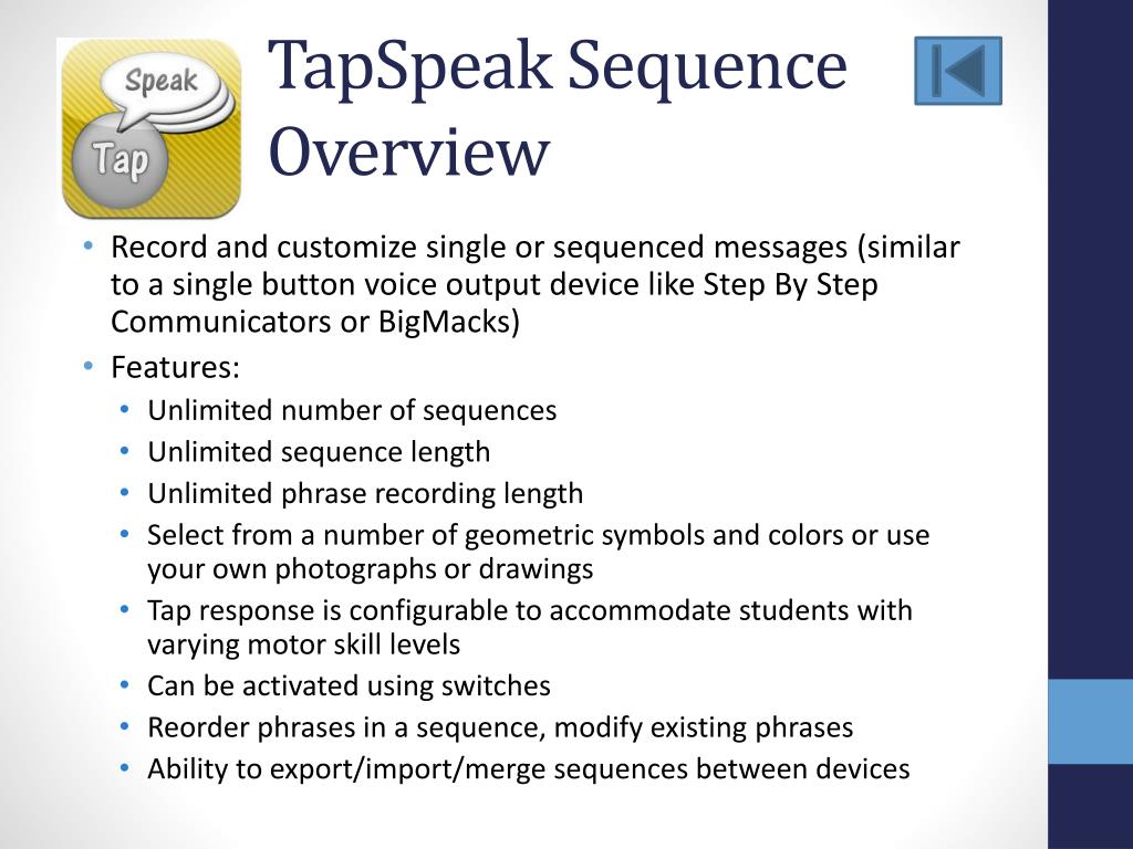 TapSpeak SequenceOverview • Record and customize single or sequenced messages (similar to a single button voice output device like Step By Step Communicators or BigMacks) • Features: • Unlimited number of sequences • Unlimited sequence length • Unlimited phrase recording length • Select from a number of geometric symbols and colors or use your own photographs or drawings • Tap response is configurable to accommodate students with varying motor skill levels • Can be activated using switches • Reorder phrases in a sequence, modify existing phrases • Ability to export/import/merge sequences between devices