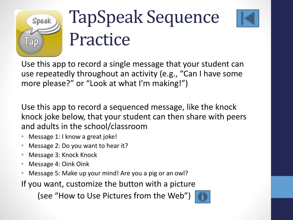 TapSpeak SequencePractice Use this app to record a single message that your student can use repeatedly throughout an activity (e.g., “Can I have some more please?” or “Look at what I’m making!”) Use this app to record a sequenced message, like the knock knock joke below, that your student can then share with peers and adults in the school/classroom • Message 1: I know a great joke! • Message 2: Do you want to hear it? • Message 3: Knock Knock • Message 4: Oink Oink • Message 5: Make up your mind! Are you a pig or an owl? If you want, customize the button with a picture (see “How to Use Pictures from the Web”)