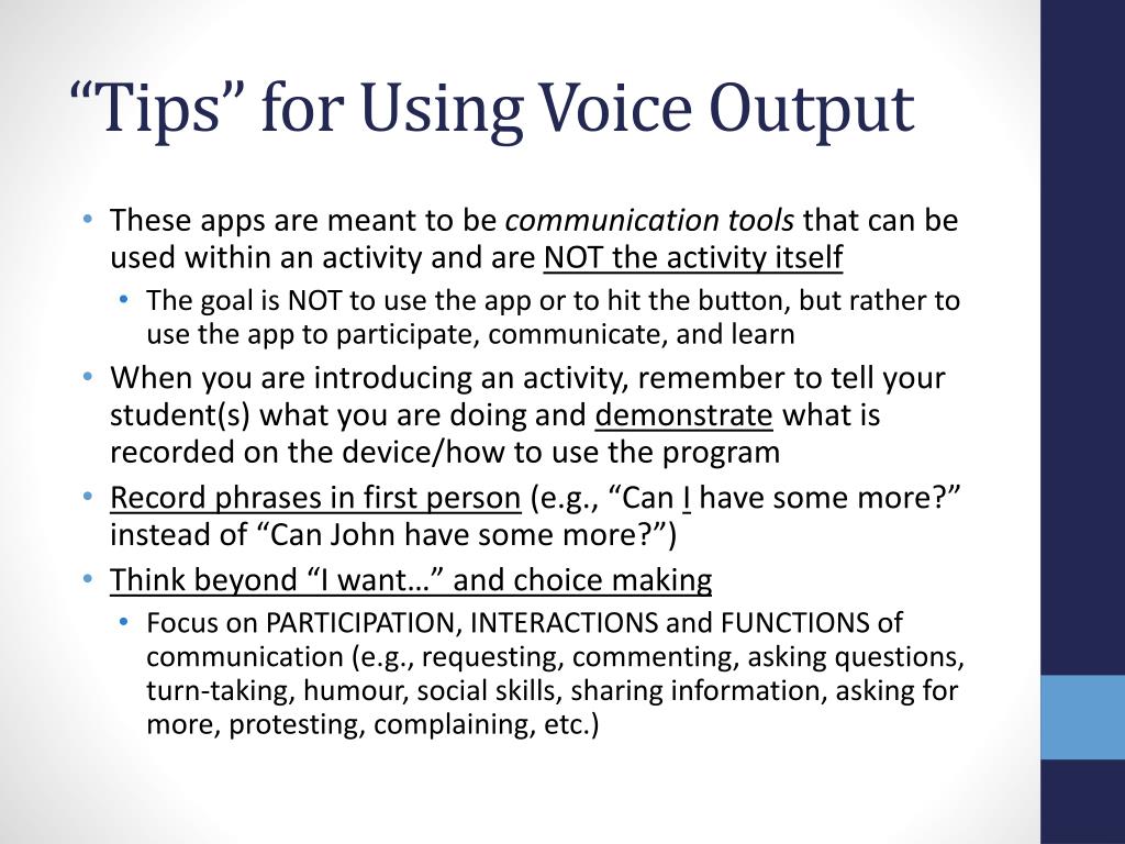 “Tips” for Using Voice Output • These apps are meant to be communication tools that can be used within an activity and are NOT the activity itself • The goal is NOT to use the app or to hit the button, but rather to use the app to participate, communicate, and learn • When you are introducing an activity, remember to tell your student(s) what you are doingand demonstrate what is recorded on the device/how to use the program • Record phrases in first person (e.g., “Can I have some more?” instead of “Can John have some more?”) • Think beyond “I want…” and choice making • Focus on PARTICIPATION, INTERACTIONS and FUNCTIONS of communication (e.g., requesting, commenting, asking questions, turn-taking, humour, social skills, sharing information, asking for more, protesting, complaining, etc.)