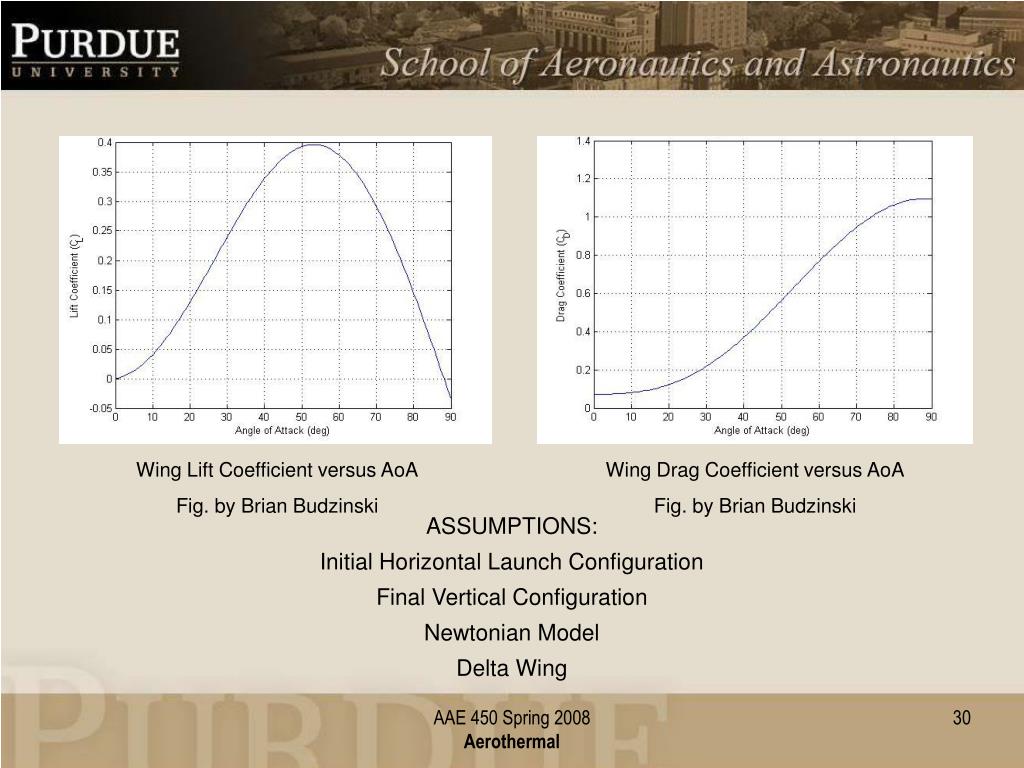 Wing Lift Coefficient versus AoA Fig. by Brian Budzinski Wing Drag Coefficient versus AoA Fig. by Brian Budzinski ASSUMPTIONS: Initial Horizontal Launch Configuration Final Vertical Configuration Newtonian Model Delta Wing AAE 450 Spring 2008 Aerothermal 30