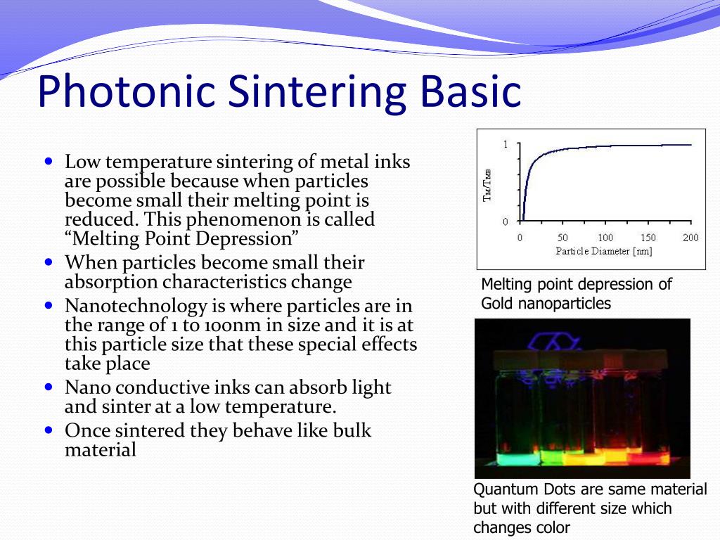 Photonic Sintering Basic • Low temperature sintering of metal inks are possible because when particles become small their melting point is reduced. This phenomenon is called “Melting Point Depression” • When particles become small their absorption characteristics change • Nanotechnology is where particles are in the range of 1 to 100nm in size and it is at this particle size that these special effects take place • Nano conductive inks can absorb light and sinter at a low temperature. • Once sintered they behave like bulk material Melting point depression of Gold nanoparticles Quantum Dots are same material but with different size which changes color