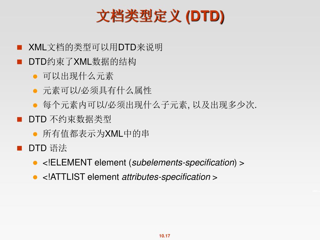 DTD的局限性 • DTD源于文档格式化, 不适合数据处理应用中的类型结构定义. • 由于DTD是XML标准的一部分, 有一些数据交换格式是用DTD定义的. • 文本元素和属性没有类型系统 • 所有值都是串, 没有整数, 实数等. • 难以说明子元素的无序集合 • 在数据库中次序通常是无关紧要的(与XML源自的文档布局不同) • (A | B)* 允许说明一个无序集合, 但是不能保证A和B各只出现一次 • ID和IDREF是无类型的 • account 元素的owners属性可能包含对另一个account 的引用, 这是无意义的 • 理想情况下owners属性应该限制为引用customer 元素